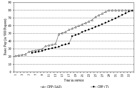 - There is a cumulative career differential in basic pay of approximately Rs.47.5 lakhs between the IAS cadre and a teacher who enters the profession with a PhD and also becomes Professor.