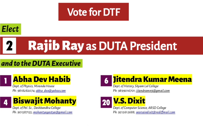 Teachers have entrusted us with the responsibility of leading the DUTA for the last eight years. We have carried out the responsibility of representing teachers in the best possible manner during extremely trying circumstances and promise to continue to honour your trust. The past decade has been a miserable period for the teachers, the University and the entire higher education sector.
