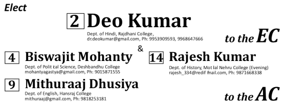 साथियों, आगामी 12 फरवरी 2021 को दिल्ली विश्वविद्यालय में शिक्षकों के प्रतिनिधि निकाय कार्यकारी परिषद (EC) और अकादमिक परिषद (AC) के चुनाव होने जा रहे हैं। राष्ट्रीय शिक्षा नीति को जिस तेज़ी के साथ लागू किया जा रहा है उससे लगता है कि इस वर्ष होने वाला यह चुनाव शायद आखिरी हो। बीते 3 दशकों से शिक्षण संस्थानों पर हमले जारी हैं, लेकिन केंद्र में 2014 में भाजपा सरकार के आने के बाद से ये हमले और भी तेज हो गए हैं। यदि हम केंद्र सरकार के नीतिगत फ़ैसलों (कृषि बिल 2020, लेबर कोड 2020, आदिवासियों की जमीनों से बेदखली, नोटबंदी, प्राकृतिक संसाधनों और सार्वजनिक उपक्रमों के निजीकरण इत्यादि) पर नजर डालें तो हमें नव-उदारवादी हमले की गंभीरता का पता देश के टूटते बिखरते आर्थिक, सामाजिक और राजनीतिक ताने बाने में दिखाई देगा।